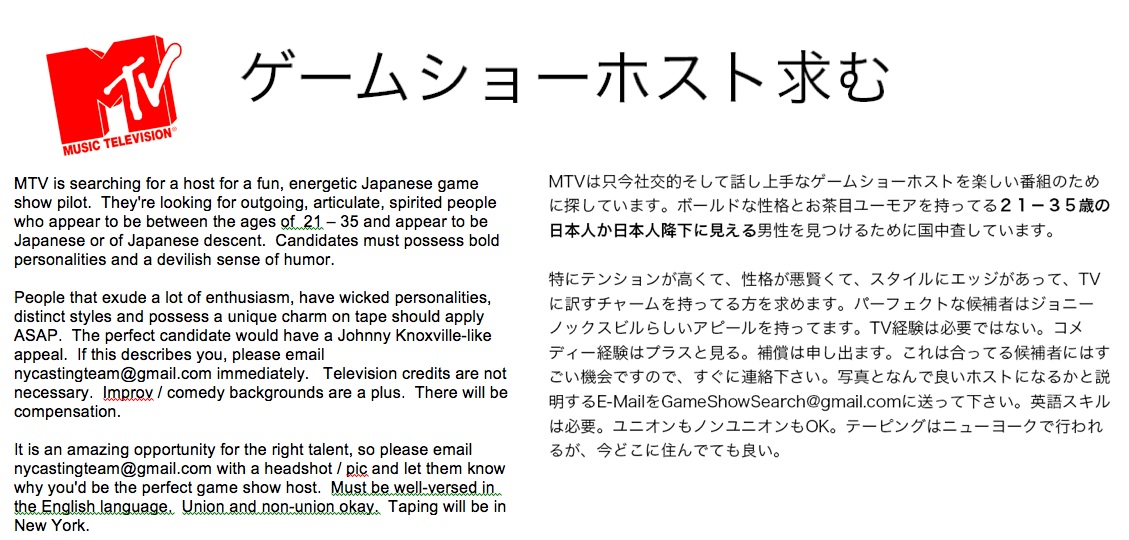 MTV is searching for a host for a fun, Japanese game show pilot. They're looking for outgoing, articulate, spirited males who appear to be between the ages of 21 – 35 and appear to be Japanese or of Japanese descent. Candidates must possess bold personalities and a devilish sense of humor.